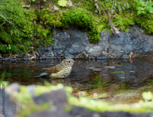 Obraz premium 森の中で水浴びするルリビタキの幼鳥
