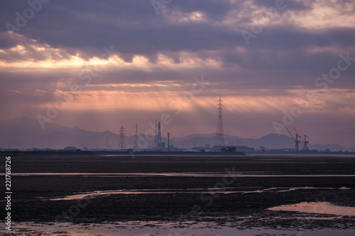 Obraz premium 今治の工業地帯と神秘的な夕焼け
