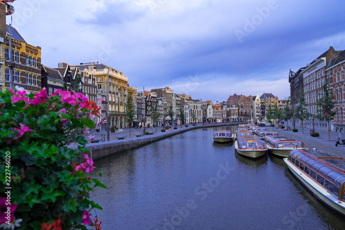 © Shin Shin, Fototapeta premium 朝日に照らされるアムステルダムの川と街並み