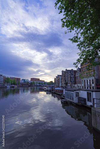 © Shin Shin, Fototapeta premium 朝日に照らされるアムステルダムの川と街並み