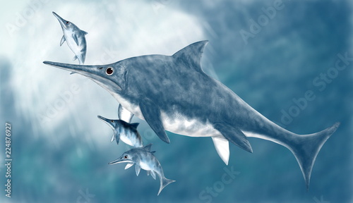 Obraz premium ステノプテリギウス、魚竜目の海棲爬虫類。体長は3メートル程度だが、最も水中に適応した現代のイルカのようなフォルム。残された化石では後頭部が盛り上がっている。イラストでは背びれ迄滑らかな盛り上がりに描いた。ジュラ紀前期から中期にかけてヨーロッパの海域に生息した。卵生だがメスの体内で孵化し、海中で体外に産み落としたと思われる。母親と3頭の幼体を描いた。背景を描いている。