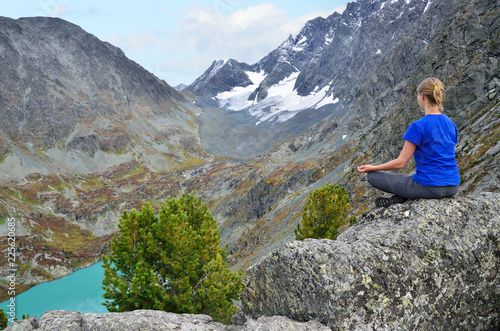 Naklejka premium Молодая девушка сидит на скале над озером Куйгук на Алтае