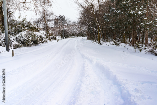 Obraz premium 広い車道の雪道に残る走行跡