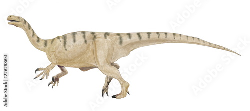 © Mineo, Fototapeta premium プラテオサウルス 三畳紀後期の竜脚類の原形(原竜脚類)。西ヨーロッパで発見されたもっとも有名な原竜脚類。前脚の親指の爪が発達しており、4足歩行では邪魔になるため、尾でバランスを取りながら2足歩行も行ったとされている。前脚の鉤爪は後ろ足で立ち上がった際、高い木の枝を引掛けるのに適しており、草食性の食性に利用したのかもしれない。学名は平らなトカゲ。背景のないイラスト。