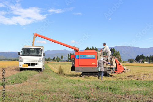 © amosfal, Obraz premium 稲刈り 作業をする夫婦 秋 青空 収穫