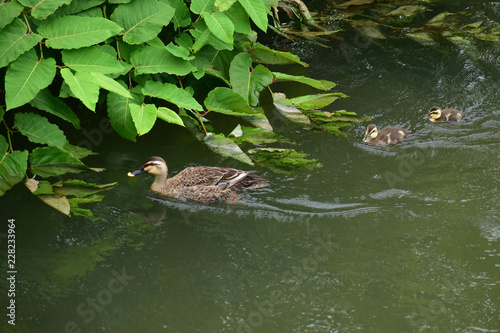 © mayudama, Obraz premium 川を移動するカルガモの親子