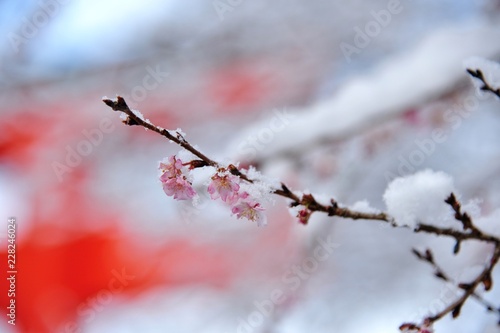© masaandsaya, Fototapeta premium 雪と桜./冬桜に雪が積もっています.