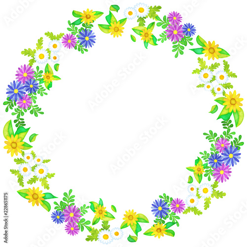 Obraz premium 水彩風の花のサークルフレーム(ノースポール,アフリカンデージー,メランポジウム)