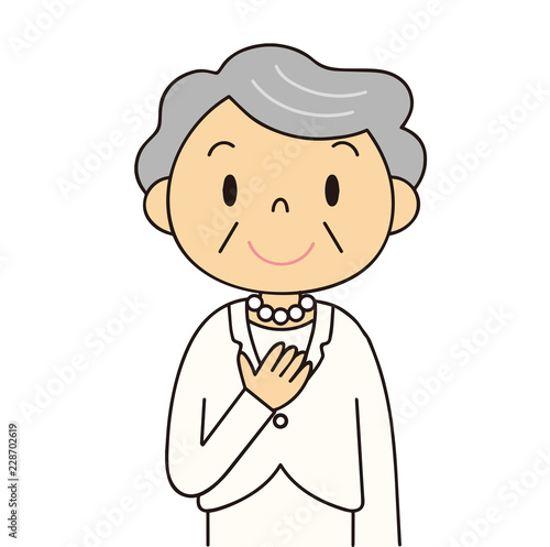 Obraz premium 二頭身 女性 シニア 白いスーツのおばあちゃん 笑顔 冠婚葬祭