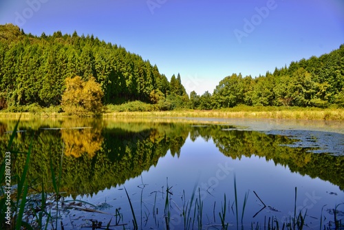 © Kazzy, Fototapeta premium 日本の滝と湖と神社のある霊場