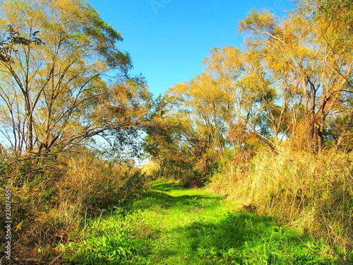 Fototapeta premium 秋の河川敷の道と黄葉の木々