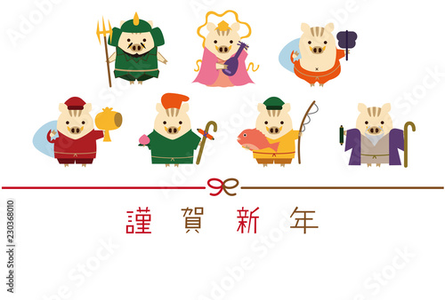 © yoshidaakiko1223, Obraz premium 猪の七福神 謹賀新年 横型 年賀状
