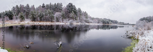 Fototapeta premium панорама пейзажа на Уральском озере с заснеженным лесом на берегу озера, Россия, ноябрь