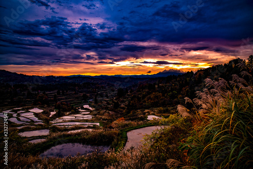 Naklejka premium 秋の新潟県・朝焼けにもえる星峠の棚田