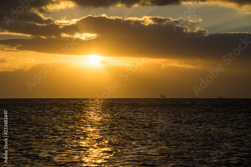 Naklejka premium 雲の間から、海を照らす朝日