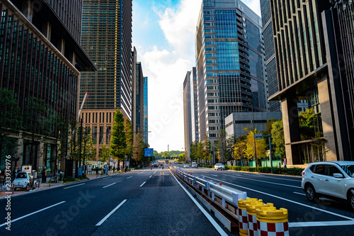 © Miho, Fototapeta premium 水平線に向かって道路が走りその脇にはいくつものオフィスビルが立ち並ぶ