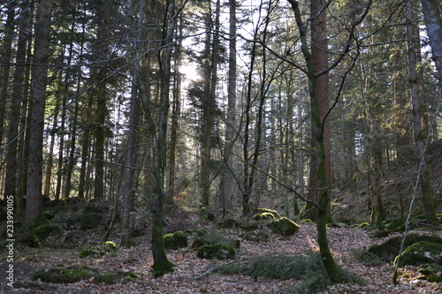 © lozinsky_s_v, Fototapeta premium Лучи вечернего солнца освещают деревья леса Тэй в Шотландии