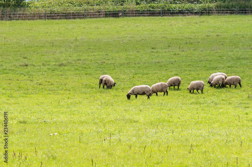 Obraz premium のんびりと草を喰む羊 / 夏の北海道 美瑛町の風景