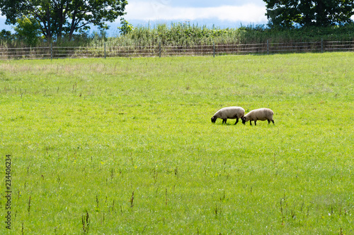 Obraz premium のんびりと草を喰む羊 / 夏の北海道 美瑛町の風景