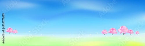 © photopic, Obraz premium 桜の木が立ち並ぶ草原 うららかな春霞の青い空