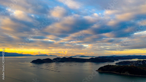 Obraz premium 瀬戸内海に浮かぶ日生諸島の頭島より長島と朝日に照らされる海と雲が明媚