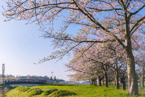 Obraz premium 宮城平筒沼早朝の満開の桜並木と歩道橋