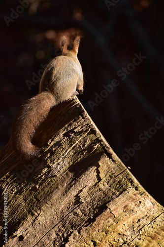 Fototapeta premium 切り株に立つエゾリスの後ろ姿