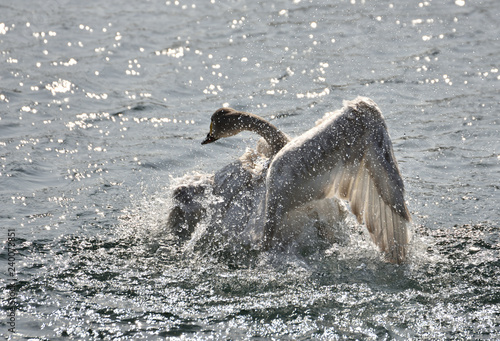 Obraz premium 水浴びするハクチョウの幼鳥