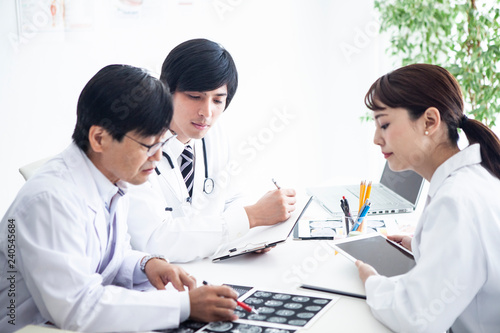 Obraz premium 医者三人が患者の資料をみながら会議を進めている
