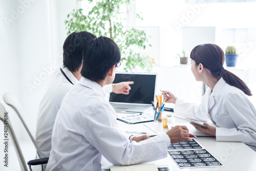 Obraz premium 白衣の女性と男性二人で会議をしている風景