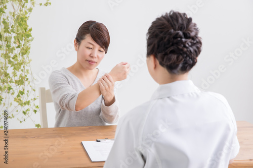 Fototapeta premium 手首が痛い女性をカウンセリング
