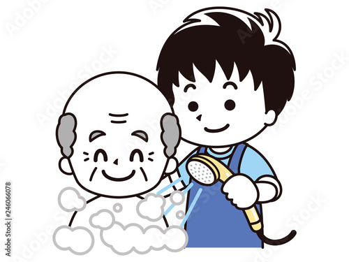 Obraz premium 高齢男性に入浴介助を行う男性介護士