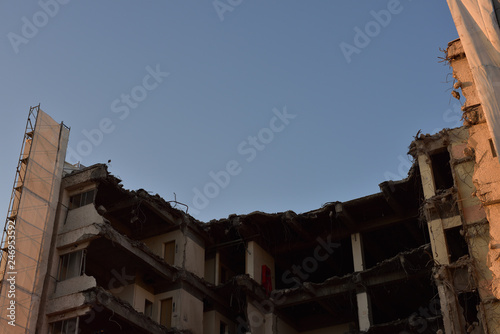 Obraz premium 夕方の日本の岡山の重機で解体中の白いビル