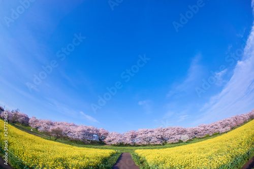 Obraz premium 広大な菜の花畑と桜並木 青空