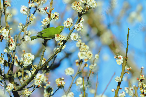 Fototapeta premium 春の野鳥、梅にメジロ、メジロに白梅、春イメージ、春風景、グリーン