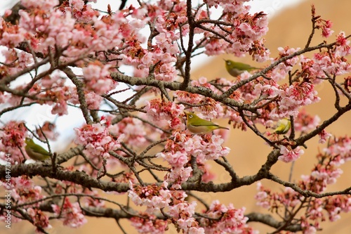 Obraz premium 大室山さくらの里 河津桜とメジロ