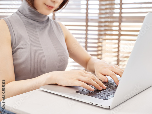 Fototapeta premium 明るいリビングでパソコンでタイピングをする女性