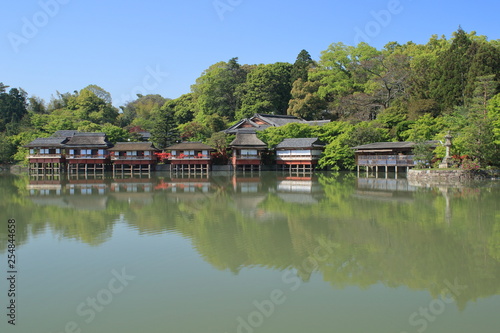 Obraz premium 京都の長岡天満宮の錦水亭と池の映り込みです