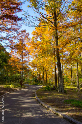 © satoru, Naklejka premium 秋の遊歩道と紅葉する針葉樹