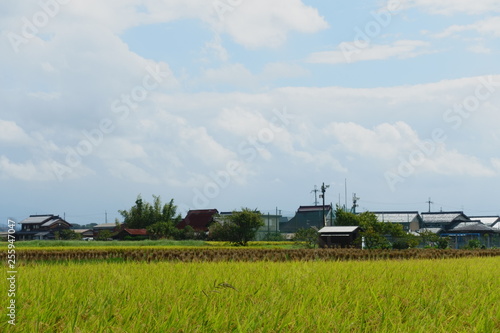 © 眞, Naklejka premium 稲穂が実る田んぼと刈り取った藁の束が並ぶ秋景色