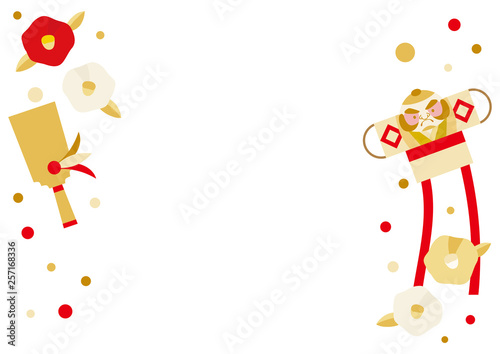 Obraz premium 羽子板と奴凧と椿のフレームイラスト(赤 金 白)