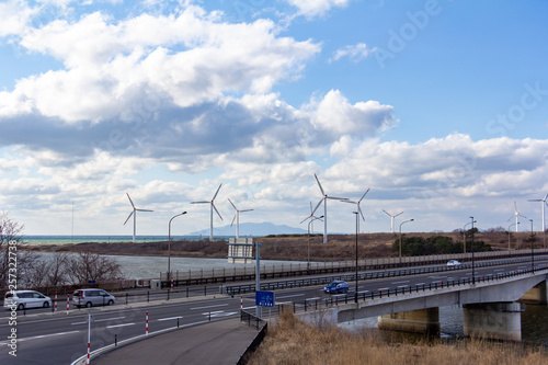 © amosfal, Obraz premium 風力発電と道路を走行する自動車 自然エネルギー イメージ