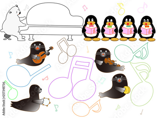 Obraz premium 水族館の動物のショータイム。ペンギンやアザラシ、イルカたちのコンサートです。