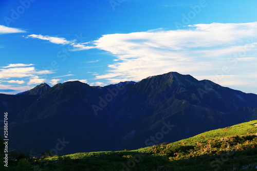 Fototapeta premium 南アルプス光岳 山頂直下光岳小屋から 夕暮れにたたずむ南アルプス南部の山々 聖岳、兎岳