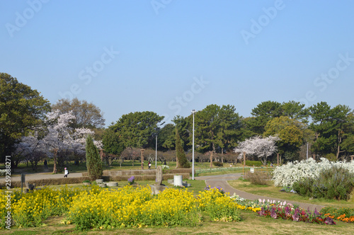 Obraz premium 黄色い菜の花、白いユキヤナギ、ピンクのサクラなどが咲いているカラフルな春の公園風景