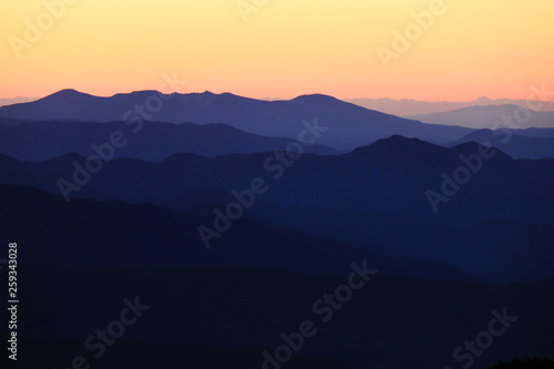 Fototapeta premium 東北飯豊山 山頂直下本山小屋から 朝焼けに煙る 安達太良山のグラデーション