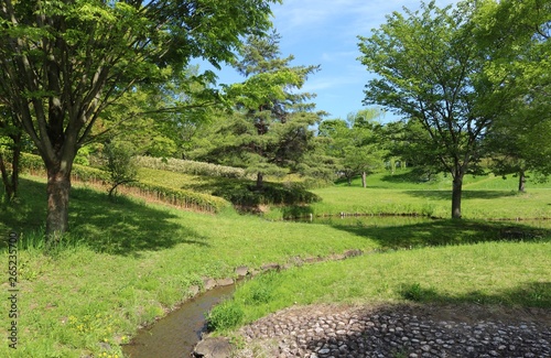 Obraz premium 風景 新緑 緑 池 木 空 爽やか 茨城