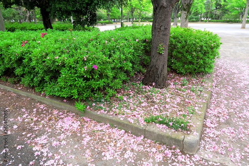 © smtd3, Obraz premium 公園の桜の木と植え込みと八重桜の落花風景