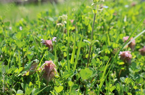 Obraz premium 草むらの中に咲くヒメオドリコソウとアマガエル