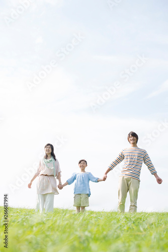 © ohayou!, Fototapeta premium 草原で手をつなぐ家族
